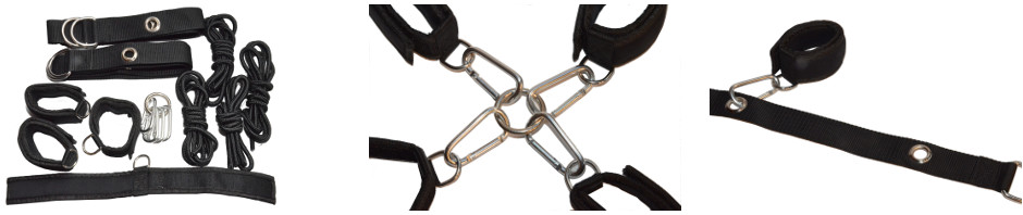 This is the original Multi Position Restraining Bondage Kit from Swedish Dreams now available at Amazon. The items can be used in many different variations. Your sex dreams and creativeness is the limit for how to use it. The most conventional ways of using it is of course in the bed, sofa, tables or floor, restraining your sex partner in various positions. You can use the ropes to fix the belts in preferred positions, or use them for traditional rope bondage.